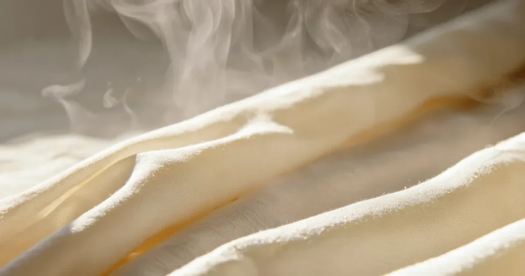 シワの強い部分から始めて、全体を均等にプレスしていきます。スチーム機能を使用する場合は、適度な水分量を保ち、過度にスチームを当てすぎないよう注意します。