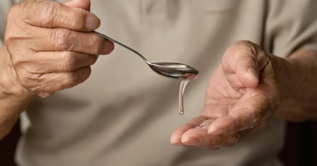 誤嚥を防ぐには、ゼリーを使うだけでなく、薬を飲むときの「姿勢」も非常に重要です。特に高齢者の場合、少しの工夫で飲み込みやすさが大きく変わります。