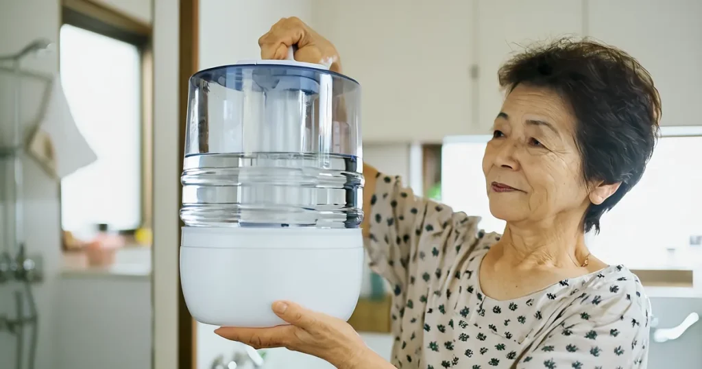 7リットルも入る大容量のタンクなので、何度も水を入れる手間が省けるのが嬉しい点です。お部屋から給水場所まで少し距離があっても、持ちやすい取っ手が付いているので安定して楽に運べます。腰や腕への負担が少なく、ご高齢の方でも安心して毎日お使いいただけるよう、細やかな配慮が行き届いた親切なつくりです。